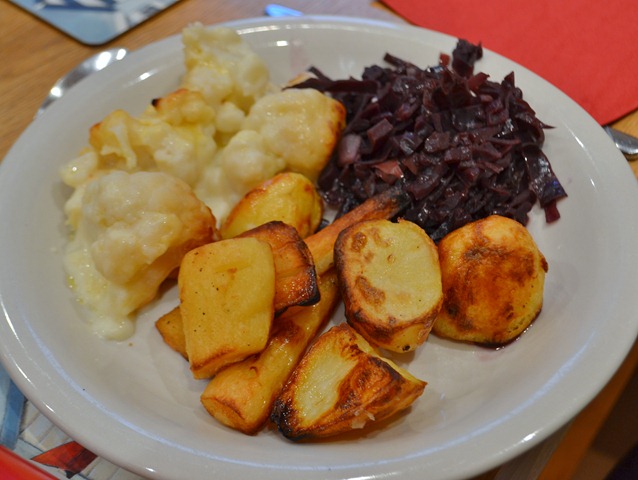 | Cauliflower cheese, red cabbage, parsnips & roast potatoes, yum! |